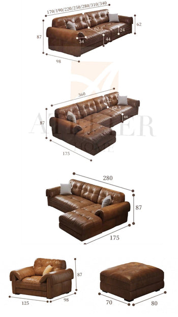 Discover the opulent relaxation and classic sophistication of the Melvin Leather Sectional Sofa. Adorned with genuine cowhide leather from Italy, this sofa is both supple and strong, guaranteeing long-lasting dependability. The tufted padding enhances its refined appearance, making it an ideal choice for any family room.